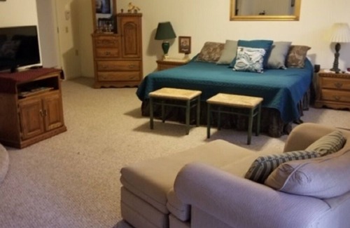 Inside the Perch, a large stone, gas fireplace welcomes you to sit and stay awhile. Beautifully decorated in a rustic fishing lodge theme, the wing-backed leather chairs and hand carved table invite you to relax. The fully furnished kitchen includes stove top and oven, microwave, dishwasher, coffee pot and all the dishes, bakeware, pots and pans you will need. Sheets, towels, linens are all included. There are teas, coffee, hot chocolate and popcorn for your pleasure. Cable tv and dvd player, and Wi-Fi included.