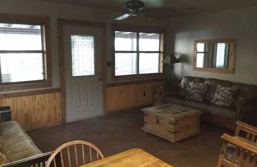 Cabin #4 is a 2 Bedroom Cabin with a queen bed in each bedroom, a sleeper sofa in the living room. Kitchen, living and dinning are all one open space. One full bathroom with tub/shower combo. Covered patio with charcoal grill and picnic table overlooking Beautiful Lake Eufaula, Oklahoma.