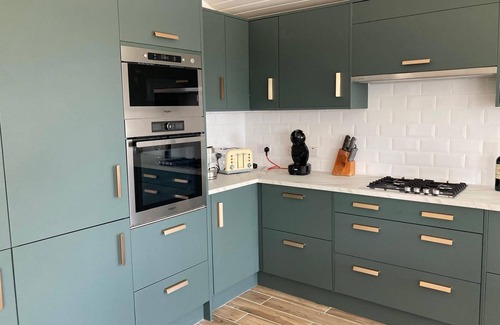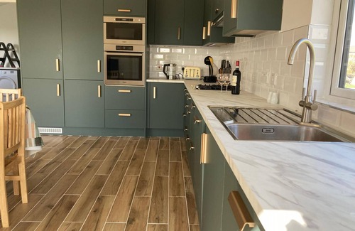 Access to the cabin, from its private driveway through the sliding patio front door into the open plan kitchen and living space. The modern fitted kitchen is fully equipped with everything you need for a comfortable self-catering stay. It includes electric cooker and hob, microwave, dishwasher, electric kettle, toaster, coffee machine, fridge freezer and ample tableware and cookware. The dining area includes a dining table and seating for four people. The living room area is furnished with comfortable sofa, side table, and includes multi-channel smart TV. The adjoining utility area houses the washing and tumble dryer machine.