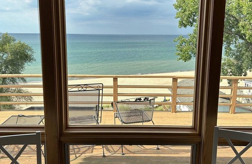 This cabin has the best view of Lake Michigan and the Chicago Skyline, inside and outside. This delightfully open cabin with two bedrooms and a perfect view of Porter Beach and Lake Michigan is nestled in the Indiana Dunes and just 53 steps away from magnificent Lake Michigan. The only thing between you and the lake is 53 stairs and a lovely sand beach. There is sleeping for 4 currently but the couch can be used to sleep 2 more people, all 3 beds are queen size. Ample seating in the living area includes dining room chairs and living room sofa with spinning chairs. The dining room table can be expanded to meet 9 persons dining needs or the leaves can be easily hidden away for a more intimate dining experience. The kitchen is spacious and fully equipped with a full size refrigerator, stove/oven, microwave, toaster, Kuerig cup coffee maker, and Central Air (Furnace/Air Conditioning). All linens (bath towels, hand towels, wash clothes and dish towels, bedding) are provided. There is a full wrap around deck with chairs and a Weber propane gas grill. The beach is a public beach, about a half mile from the main Dunes State Park Beach, we have beach toys for children of all ages, footballs, spike ball, soccer balls and other beach games. This is the top level of a 2 story cabin with 2 parking spaces, there are no people staying in the basement of the property, it is unfinished. Should you want to venture beyond the beach numerous nearby attractions include Chesterton European Market (Saturdays), hiking, biking, dining, breweries, shopping, museums, art galleries, an arboretum, golfing, waterpark, farmers markets, live theatre, movie theatres, skating, bowling and much more.