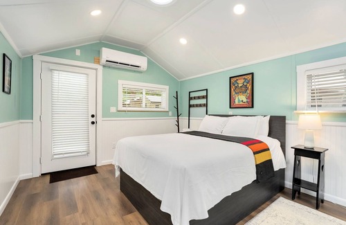 This unique river cabin offers a queen-size bed for a restful night's sleep. The kitchenette is equipped with a mini refrigerator and microwave, with a built-in bar-top eating area. You'll enjoy stunning, up-close views of the Cache la Poudre River. Natural sunlight streams in from the skylight overhead, creating a warm and inviting atmosphere. While the cabin does not have an indoor bathroom, it is conveniently located near our outdoor bathroom facility and brand new comfort station, which feature private bathrooms and showers to ensure your comfort and privacy during your stay.