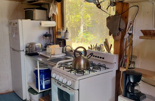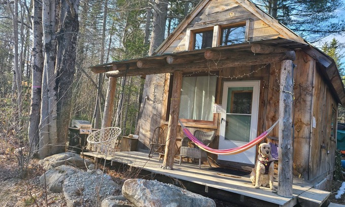 Unique glamping cabin across from babbling brook. Non-piped water system includes foot pumps for faucets, hand pump for drinking water & shower bag (heat water on stove).On quiet road, 3 miles to Stratton (7-minute drive). Wood-fired sauna, swimming hole, fire pit, hammock, propane BBQ, picnic table, brook view, TV w/ VCR & videos, turntable & records, games, internet & wifi 20-100 mbps.Staircase to loft, gas heat, wood stove. Full kitchen including gas oven, refrigerator & coffee maker. Easy to use, odorless composting toilet. Dog friendly.