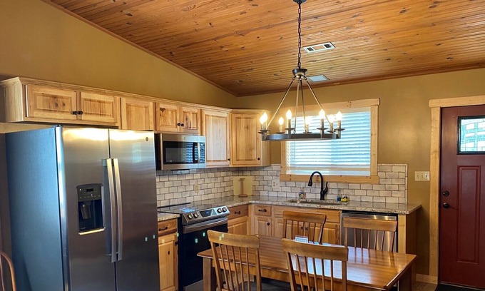 Beautiful View of Bull Shoals lake from this cabin. All new kitchen and appliances. Ice maker and dish washer. We have a very large pool and a private dock that will make all the members of your family happy.