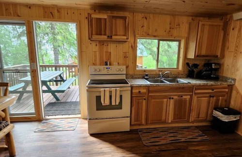 Cabin 8 is a newly remodeled cabin that is more secluded and quiet. It is about 10 steps away from the stairs leading down to the dock. It sits on the bank of the lake with a tree that grew through the porch which gives it great shade. It has a fully equipped kitchen with 4 twin beds and a couch that converts into a bed and a bathroom with a shower. Every room has fans for warm days, but it almost never gets very hot here. Relax and enjoy the sounds of the loons in the evenings.