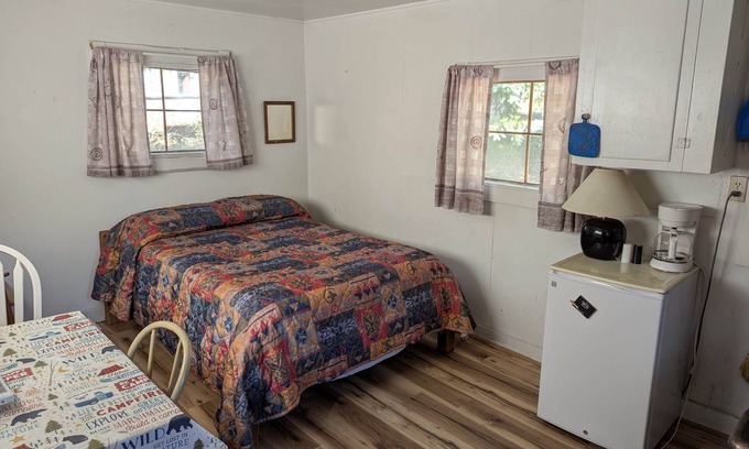 Please note: This is a rustic cabin, meaning there is no bathroom inside. We have a climate-controlled shower house with bathrooms behind the store building.