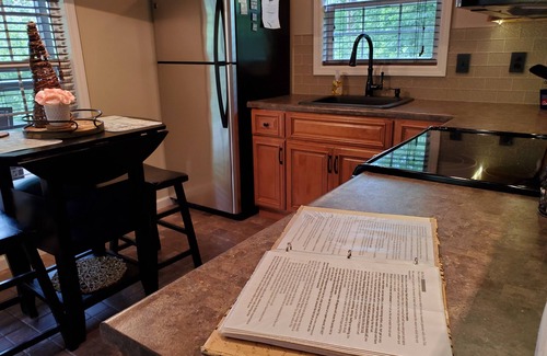 Cabin Includes spacious Living Room with electric fireplace with vaulted ceiling and Full kitchen with cooking utensils. A Full Bath and 2 Bedrooms Master Bedroom King Size Bed and Guest Bedroom Queen size bed.