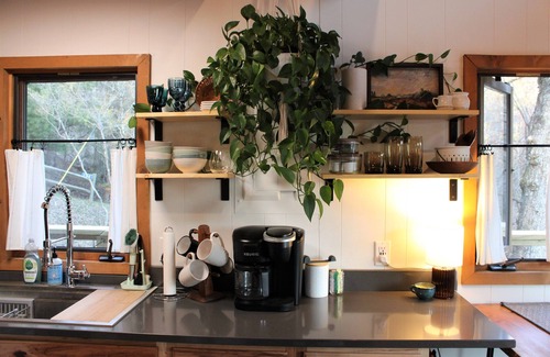 The kitchen has a full size fridge, a microwave, oven and stove. Plates, cups, utensils and most basic cooking supplies are available for use. Coffee maker and coffee bar will have enough coffee and supplies provided to at least get you through your first morning. There is not a dishwasher but all supplies for hand washing dishes are provided, the dish drying rack is located under the sink. Additional information based in frequently asked questions. There is NOT a hot tub on this property. There is not central AC, there is a small AC unit in the loft bedroom and in the lower bedroom. The heating sorces are baseboard heaters controlled by thermostat and a pellet stove in the loving room. This cabin is pet friendly and there is a pet fee of $35. Maximum amount of pets is 2.