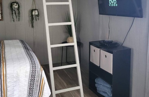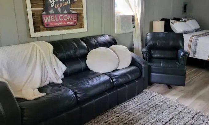 Surrounded by woods and lots of ATV trails. Golfing is a short distance away at Flint Resort. Cabin sleeps 5 comfortably. Gas grill and fire pit are onsite. Separate Bathhouse provides toilets and hot showers and the security lock makes it completely private. Pet friendly. Theres another campground to Book your river activities. Within walking distance or a short drive down the road. They can even offer to drop/pick you up when you are done. If your not floating the river, we have corn hole, lawn darts, volleyball and extra river chairs available for guests. They are located inside the deck boxes at the bathhouse.