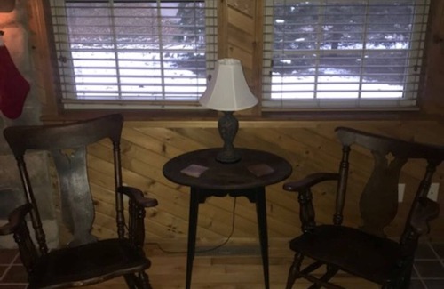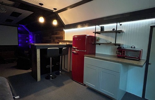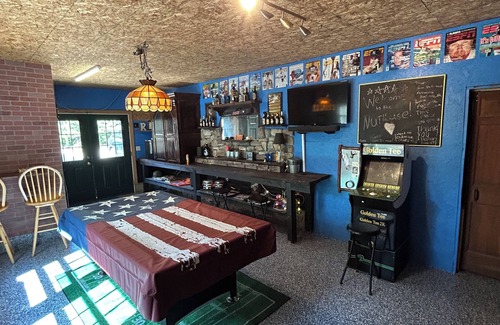 This beautiful cabin is spacious for large family gatherings yet cozy for a couples weekend. The house has one bedroom on the first floor with a large loft above. The knotty pine decor and wood-burning stove provide the ultimate cozy cabin experience. The garage has a sports bar to watch the games or listen to your favorite tunes while shooting darts or playing pool. The garage loft has a 110” projection screen theater room with 5.1 Dolby surround sound (great for games and movies). There is an outdoor fire pit and a gas grill for your use. The patio has a propane Blackstone grill, and there is a Webber charcoal grill in the garage.