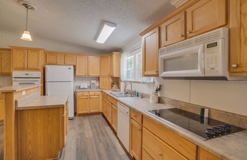 J cabin is one of our larger cabins. Its three bedrooms and two bath. The master has a king size bed with a private bath with a garden tub and stand-up shower. The has a large kitchen and dining table that seats six. The open living room has a wood burning fireplace and satellite TV. The seconds and third bedroom feature a queen size bed and two twins, that share a guest bath. Another great addition to this cabin is that it has its very own wash and dryer. Enjoy your time on the deck surrounded by the National Forrest while grilling for the family or roasting smores in the fire pit all while being just a short walk to the lake.