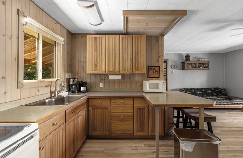 Our cozy cottage features 2 bedrooms, a spacious living room, a fully equipped kitchen as well as a charming two-seater outhouse. Enjoy modern comforts with new flooring, an updated kitchen, a cozy propane fireplace, and a brand-new stairway leading to the water.