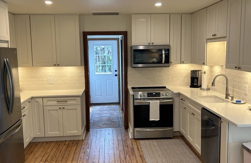 Cozy private getaway located on French Quarter Creek, within the Cooper River Watershed and adjacent to the Francis Marion National Forest. The cabin has been completely remodeled and is approximately 1,000 square feet with 2 bedrooms (1 queen and 4 singles in the bunk room) and 1 bathroom. The living room is loaded with windows and overlooks the backyard and French Quarter Creek. The cabin sits on almost an acre and is very private, being the last house on the road. The huge deck runs the width of the cabin and overlooks the creek. Off the beaten path, but close to everything. 10 minutes from Shipyard Park, 20 minutes from Mt Pleasant, 30 minutes from Daniel Island, and 45 minutes from downtown Charleston.