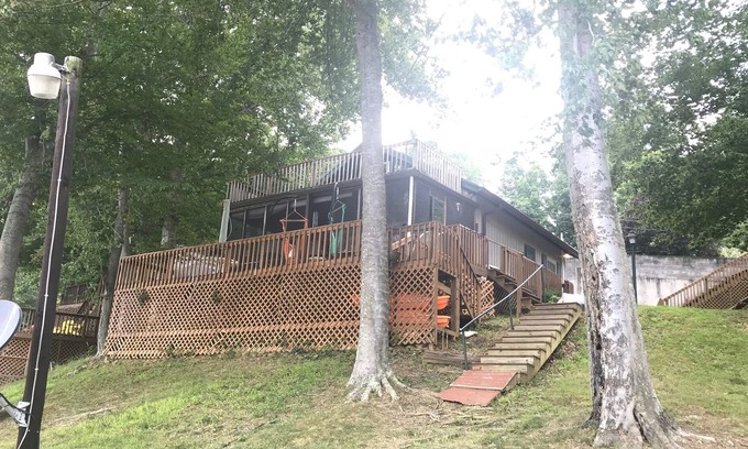 Relax on the lake 50 feet from the water. Use of your own private dock to swim, fish, or tie your boat up. Large yard for the kids to play. 3 bedrooms with enough room for 10 people. Covered and open decks off of the main house. Deck off of the master bedroom with a great view of the lake. Full kitchen with a gas grill. Extra refrigerator to cool off all of your beverages.Excellent fishing from the shore or dock. One kayak and one paddle board available for your use.