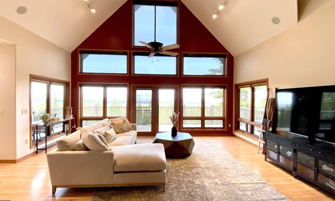 The upper floor has a loft which looks through the large windows opposite. Two bedrooms each have a queen bed. There is an ensuite full bathroom. The loft has a sleeper sofa for additional sleeping space.