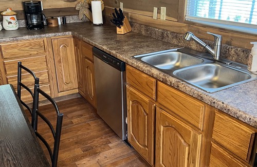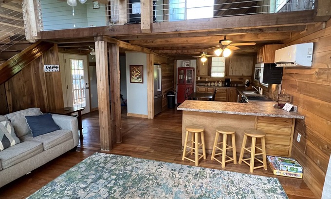 This cabin has a twin bed sleep nook, eat in kitchen, & living room on the main floor. In the loft, is the queen size bed, reading nook & bathroom.
