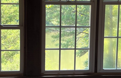 The inside of the cabin is almost entirely poplar wood boards. The stair rails are cedar wood. The cabin boasts soaring ceilings and many windows overlooking the pond.
