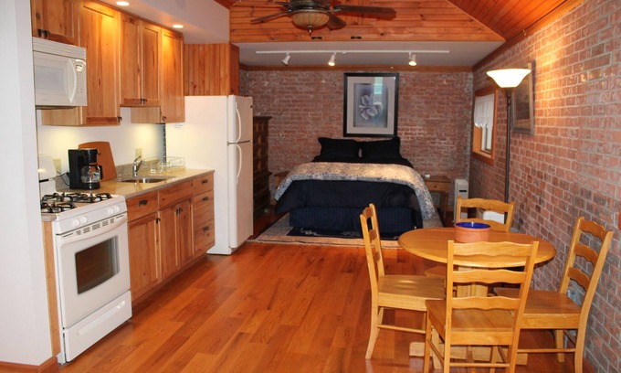 The building as fully exposed brick, hardwood floors and cathedral ceilings. There is a nicely appointed kitchen to make a meal. There are heated mattress pads to keep you toasty in the winter and a ceiling fan to cool in the summer. There is WiFi .