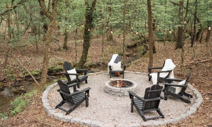 Creekside Cabin features a super comfortable living room, chef’s dream kitchen, 2 dedicated office workspaces, wrap around porches, hot tub, luxury gym, lounge game room, BBQ, outdoor playground and firepit situated by the rippling creek on our property!