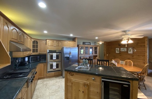 - toaster, microwave, air fryer, 12 cup coffee maker, double oven, large gas stove, refrigerator with ice maker and water filter, large kitchen table with 6 chairs, 2 bar height chairs at kitchen island, dishwasher