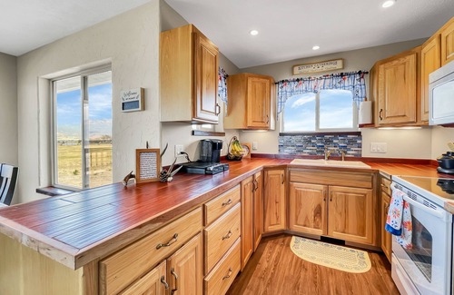 Feast your eyes on this awesome and unobstructed view of the West Elks Mountain range and Grand Mesa from our big front porch! The house features 3 bedrooms, 2 bathrooms, living room with sleeper sofa, fully stocked kitchen, dining area, and a second living area downstairs. Outside you’ll find a patio with fire pit where you can sit around a campfire and enjoy the incredible view of Needle Rock and surrounding mountains. We also offer an RV site with full hookup. The Black Canyon is nearby, where you can take in the awesome views and some amazing hiking. Also Crawford reservoir, which offers the opportunity for fishing, boating, kayaking etc, is just down the road. The small town of Crawford has a coffee shop, cafe, and other unique shops. Also a convenience store and hardware store where you can buy groceries and other necessities.