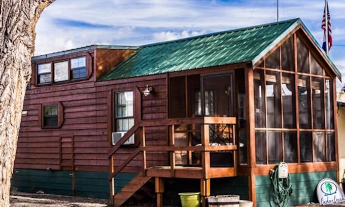 Cabin with one queen bed, two lofted twin-size beds and a queen pull out couch Sleeps: 6 Pets: 2 Parking: 1 Cooktop, toaster, microwave, coffee maker and mini fridge. Cookware, dishes, silverware, etc. provided. Shower, sink toilet. Towels, shampoo and soap provided Smart TV located in the living room. You can sign into and watch your streaming services (Netflix, Hulu, etc.) on the TV, we do not provide any TV services/cable at this time. Private, screened-in porch. Dogs are allowed for a one-time, non-refundable cleaning fee of $50 for up to two dogs in rented accommodations. No additional pets are allowed.