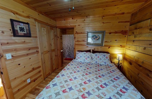 New cabin on 10 secluded acres. 1 bedroom/1 bath, sleeps 2. Access to 1 acre fishing, swimming and paddle boat. Hot tub, grill, gas fire place, fire ring, 32" TV/DVD. Deer and Bird Feeder stations. Now Pet Friendly!