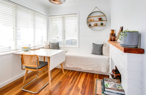 The house is built in the 1950's with a fresh beachy minimal interior. The kitchen and bathroom are in their original style with 1950's retro. The home has a breakfast table in the kitchen with a table and bench seating- such a perfect spot to drink coffee and catch the morning sun. Then the larger living room includes a 6 seater sofa, large dinging table by and NZ designer and iconic Warmington Studio Fire.