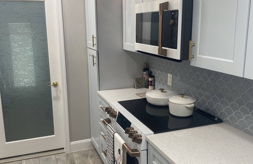A beautiful array of color and comfort. Bohemian bungalow with the ultimate luxury from new gel mattresses, fine linens , finest cookware and sheer comfort. Private back yard with hot tub for two, firepot and lovely surroundings. Minutes to shopping, dining and the beach.