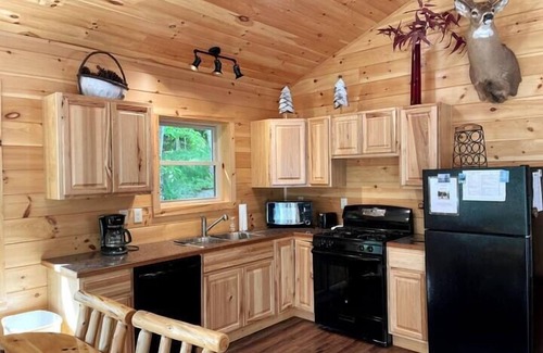 This cabin has two bedrooms one has a King bed, the other has two queen beds in it. One and a half baths, full kitchen and living room.