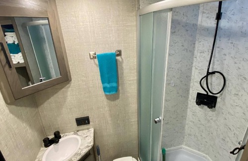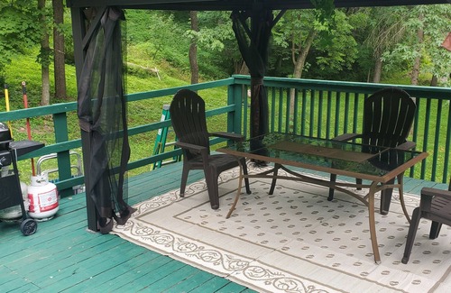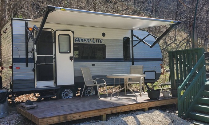 Thisl RV is located within feet of a beautiful waterfall. There is also a deck with a grill and canopy with seating. If you camp, there has to be a fire pit! Which is located in front of the RV! Look forward to your stay!