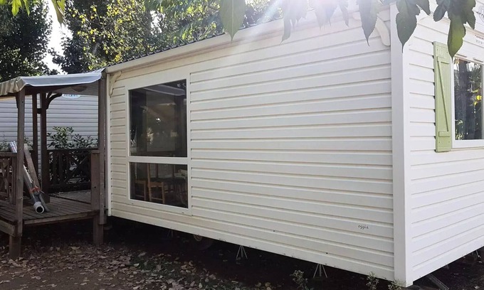 Accommodation: Mobile home 3 Rooms 4 People with:Lounge cornerKitchen corner equipped (dishwashers and complete utensils, refrigerator, electric coffee maker, microwave, kettle, 4 burners, sink)1 bedroom with 1 double bed (140 x 190)1 bedroom with 2 single beds (70 x 190)Shower room with sink, toilet in the bathroomCovered terrace with garden furniture