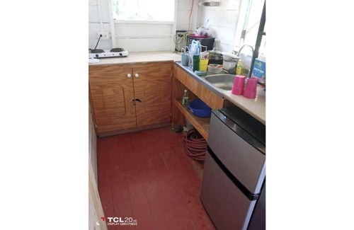 Shared chattel house with hot shower, toilet, sink, kitchenette, and covered deck