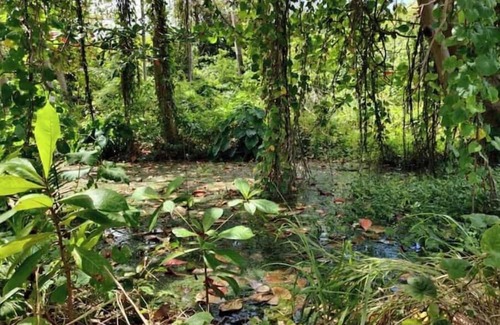 7 acres of coconut-fringed hayfield + shaded forest with a pond & stream (with tadpoles, frogs, and crayfish – part of the adventure!)