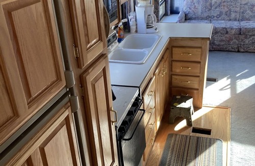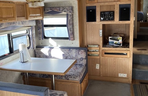 Our spacious RV has all the amenities of home with the beautiful view of the Tetons right at your door step. Take a stroll down our grassy knoll over to the river that runs behind the property or relax in the hammock after playing a game of horse shoes. Our destination features a fire pit perfect for roasting s’mores after a day of fun in the mountains or nearby tourist destinations. We look forward to hosting you at our little space of heaven