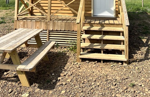 This cozy one room cabin is full of rustic charm and has a Twin XL/Full XL bunk bed and a full size futon sleeper which allows it to sleep 5 guests, table w/ 4 chairs, microwave, coffee pot, mini fridge, shower/toilet/sink, Mini split A/C & Heat, Electric space heater, and tankless water heater for endless hot showers! Each cabin has a picnic table and fire ring with cooking grate outside. These are camping cabins so you'll need to bring your own towels, linens, and cooking supplies just as if you were tent camping. Toilet paper and coffee filters are provided. Ice and firewood are for sale onsite.