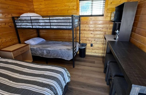 Camping Cabins are our most basic cabin and has everything you might need except plumbing in it. They have a queen bed and a set of bunk beds, heating/AC, mini-fridge, microwave, coffee maker, and a table with stools. We have them set up for you with all linens and bath towels included for your stay. We have a bathhouse very close by where you can shower and use the restroom during your stay. Outside the cabin you have a gravel parking spot for your vehicle, a picnic table and fire pit. We have additional parking for extra vehicles and trailers on site at no additional charge.