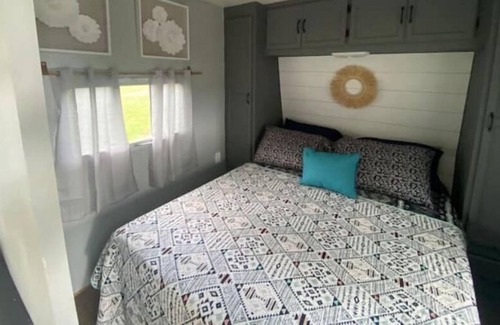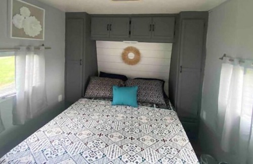 Our fully renovated Cascade Coachmen sleeps 6, with a master bedroom that offers privacy, 3 camper bunks, and an extra sleeping space in the main family area.