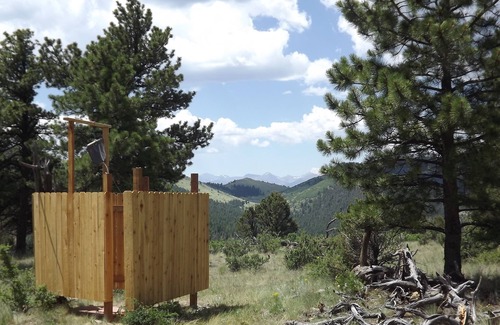 Shower outdoors in a private enclosure that is open to sky, trees, and mountains. Individual solar shower containers provided for each guest. Body wash, shampoo, and conditioner are provided as well. Bring towels.
