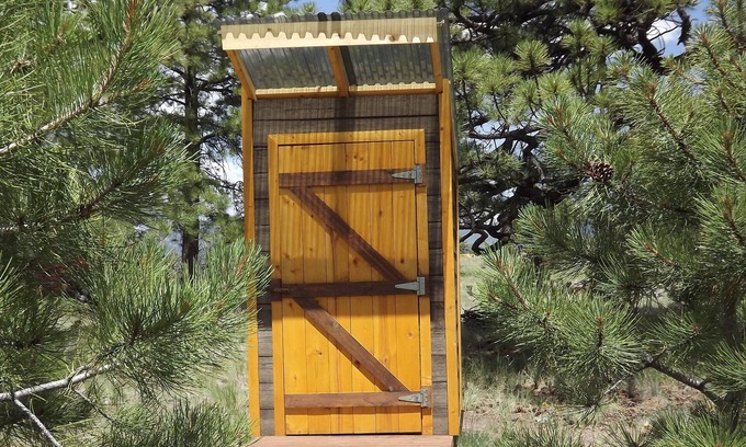 Toilet is in unique multi-wood outdoor enclosure. Air freshener, hand-sanitizer, hand towels and reading material appropriate to the setting are provided. :-)