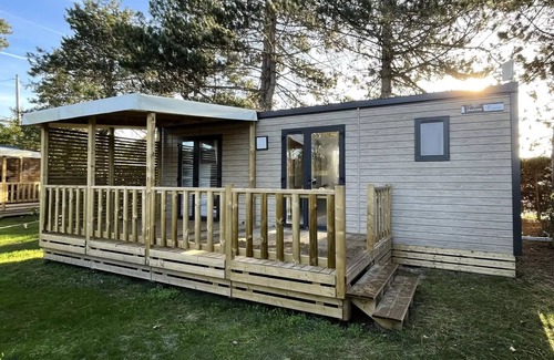 Accommodation: Opale Lounge – Comfort for a relaxing holidaySpacious and modern, the Opale Lounge, with its 35 m2 and its semi-covered wooden terrace of 15 m2, is designed for a romantic stay or between friends up to 5 people. This mobile home offers a perfect setting for a memorable seaside holiday.