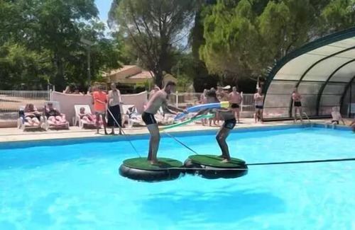 Sports and playground Water sportsKayak, Outside the property, 30km, PayingSportsOutside the property, 0.3km, Paragliding, PaidTable Tennis, Inside the campsite, Open all season, FreePetanque, Inside the campsite, Open all season, FreeHiking, Outside the property, 0.1km, FreeRiding stable, Outside the property, 4kmBicycle path, Outside the property, 0.1km, FreeGolf, Outside the property, 15km, PaidClimbing, Outside the property, 30km, PayingEntertainmentAccrobranch, Outside the property, 13km, PayingKarting, Outside the property, 15km, PaidAnimal park/Zoo, Mount Faron, Outside the property, 26km, PayingAnimal Park/Zoo, Tropical Birds Garden, Outside the property, 24km, PayingAnimal Park/Zoo, Turtle Village, Outside the property, 21km, PayingGamesBilliards, Inside the campsite, Open all season, PaidBaby football, Inside the campsite, Open all season, PayingTrampoline, Inside the campsite, Open all season, FreeChildren's playground, Inside the campsite, Open all season, Free TradeShopsBread dump, Inside the campsite, Open in July and AugustDescriptionThe village and its shops are 5 minutes walk awayRestaurantsSnack bar, Inside the campsite, Open in July and AugustBar, Inside the campsite, Open in July and AugustEstablishmentestablishment.establishmentClassifications.labelNatureSituationThe warm and friendly ambiance, Multiday entertainment in high season, Heated swimming pool, Bronze2021 Silver2023Other information100 pitches, 50 accommodations, 50 bare pitchesSwimming pool and water gamesPoolside facilitiesFree deckchairsPoolsCovered and discoverable, Heated, Unsupervised swimming, Open all season, 3 slides, With paddling pool, FreeUseful informationFrom the opening of the campsite, take advantage of the covered and heated swimming pool, which can be discovered in good weather, to make some lengths or stroll over the deckchairs that are available. Feelers will try water slides, while the smaller ones will have fun in the paddling pool. Water bodiesSea, 30kmRiver, 0.3kmEventsEventsChildren's Club, Open July and August, Free, 4 to 10 years oldFamily entertainment, Open from 1 July to 26 August, FreeDescriptionIn July and August, children aged 4 to 10 are welcome at the children's club for fun and supervised sports activities. Two afternoons a week.In the morning, you can participate in gymnastics classes, while in the afternoon, sports tournaments are organized.In the evening, you can dance and sing at the rhythm of the 1980s at the theme evenings organized in summer.Do not hesitate to request the program upon arrival.ServicesMiscellaneousPaying, paying WiFiRentals and equipmentTV at the barUseful informationGeneral informationFrench, Open from 29 March to 30 September, Recommended car, Practical informationYou must declare your dog at the time of booking. Otherwise, you will be refused upon arrival at the campsite. Category 1 and 2 dogs are strictly prohibited.AccessTrain station 15km