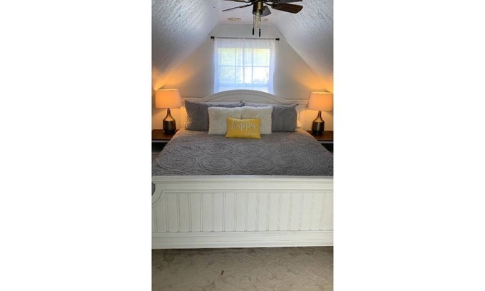 This is a cute little cottage with a pull out sofa and sectional downstairs and a King Master suite upstairs. It is as comfy as it looks and steps from downtown.
