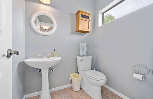 Two inviting bedrooms reside on the main floor, sharing a well-appointed bathroom. The first bedroom features a luxurious king-size bed and private access to the canal-view deck. The second bedroom offers comfortable sleeping arrangements with two queen-size beds. Each bedroom boasts its own vanity sink for added convenience. Tucked away on this level, a laundry nook adds a touch of coastal charm.