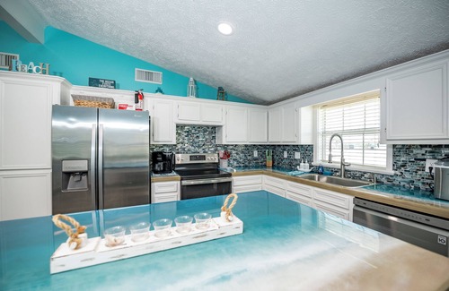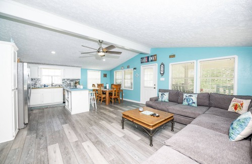 As you enter Christal's Castaway you'll find an open concept living, kitchen and dining area. The kitchen is fully stocked with everything you need. You and your guests will have ample space to prepare meals and enjoy time together making memories! The living room has an oversized sofa, offering comfy seating for those looking to relax indoors.