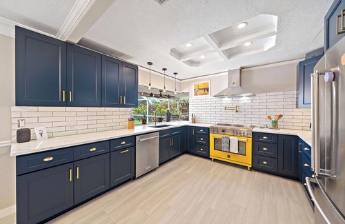 • Gourmet Kitchen – This home features a vibrant and fully renovated gourmet kitchen overlooking the outdoor patio and pool area with modern appliances and all the essentials you'll need for cooking at home. Perfect for the chef or culinary enthusiast. It has a large kitchen island with additional seating (and games) that opens up to the dining area with a cozy fireplace.