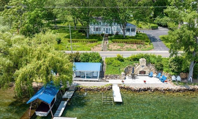 Known as "Hearthstone" House this charming historic lake house was built in 1835. The wide board floors and low ceilings give it a cozy farmhouse feel but with modern amenities like central air conditioning. Fantastic lake views from every room. Spectacular waterfront (175 feet) has a stone fireplace and two wade in natural beaches. There are four kayaks and sunfish sailboat available for your use. Rent a larger boat down the road at the marina or bring your own and park it at the private waterfront dock.