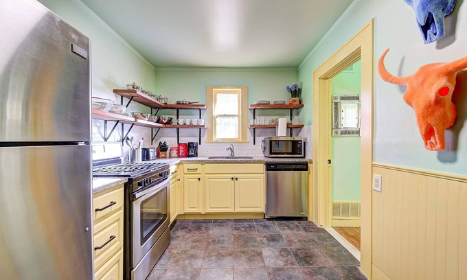 Brighten your trip with a stay in this whimsical & cozy 800 sq ft home, furnished & decorated specifically for short-term rentals. Walking distance from Iron Starr BBQ & just blocks from OKC's beloved Paseo Arts District. Quick access to I-235.