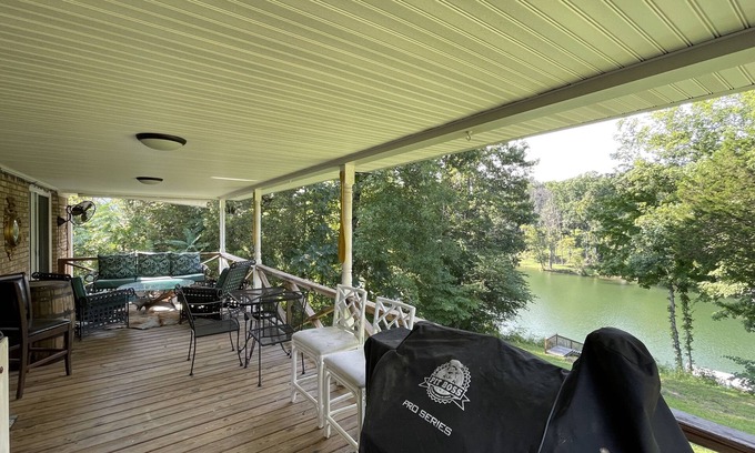 Large covered back deck overlooking the river & dock for amazing views and all day sits watching as the waters are filled with fun.