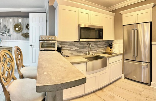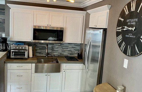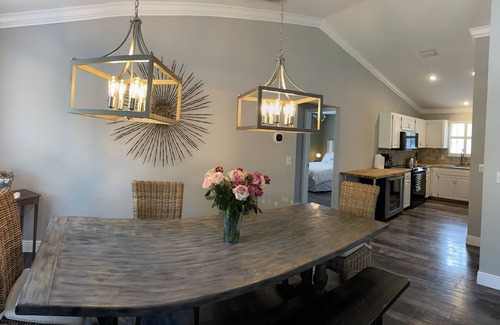 This property is great for large family gatherings with plenty of space to spread out. This vacation home has a total of 5 bedrooms. With 3 bedrooms and 2 bath upstairs plus this house also has a separated Master Studio Suite in the lower level portion with its own entrance. This Suite has a kitchenette, king bed, twin over full bunkbed, twin pull out sofa and full bathroom with tub/shower. The upper and lower levels of the home are not connected through the inside of the home. They have separate outside entrances. It has a large heated saltwater pool and plenty of outdoor space for grillin and chillin! An abundance of outdoor patio furniture including hammocks for relaxing. On the front porch you can enjoy morning coffee in the sun. Kitchen has a Large dining table with seating for ten people. Open concept living area has large sectional couch and 70 inch TV. This home also has smart TV’s in every bedroom. Location is key with this home! You can walk across the street to the fishing pier to throw in a line or just watch the sunset. Or walk 2 blocks to quaint downtown Palm Harbor which has DeBines Brewery, Salty Lime Cantina, Thirsty Marlin, Fireside Pizza plus more! You can also hop on the Jolly Trolley which will take you to Famous Clearwater Beach or do some shopping in Tarpon Springs. The Pinellas Bike trail is one block away this house has 4 bikes for guests to use. Looking for adventure? Busch Gardens Theme park is only 22 miles away. Also Disney World and Universal Studios are only 76 miles away. Plenty of opportunities for fishing close by with deep sea, backwaters or bass fishing on Lake Tarpon. Plus very close to many beautiful golf courses including the famous Innisbrook- Copperhead Course. Short drive to see any of the major sports teams Go Champa Bay! Bucs, Lighting and Rays! Plus spring training camps for Toronto Blue Jays and Philadelphia Phillies. You really cannot find a better central location to everything Tampa/Clearwater has to offer.