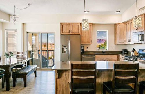 Canthony's Cottage is a beautifully decorated, charming condo in Estancia on the 3rd floor! It has stairs or an elevator so anyone can stay and the floor plan is all one level. The minute you step in, you will love it. The living room is spacious with 3 leather sofas (2 are sofa sleepers). A lovely entertainment center holds your flat-screen TV and a fun fireplace to use. The kitchen is pristine and has knotty alder cupboards, granite countertops, and sleek stainless steel appliances including a 6-burner gas stove. The kitchen has all you need to prepare and serve your family meals. The dining room table is large and can seat up to 6 with additional seating for 3 at the kitchen counter. Just outside through sliding glass doors is a deck with seating and a grill for more cooking options. Enjoy the views and relax all year round outdoors here in St. George!